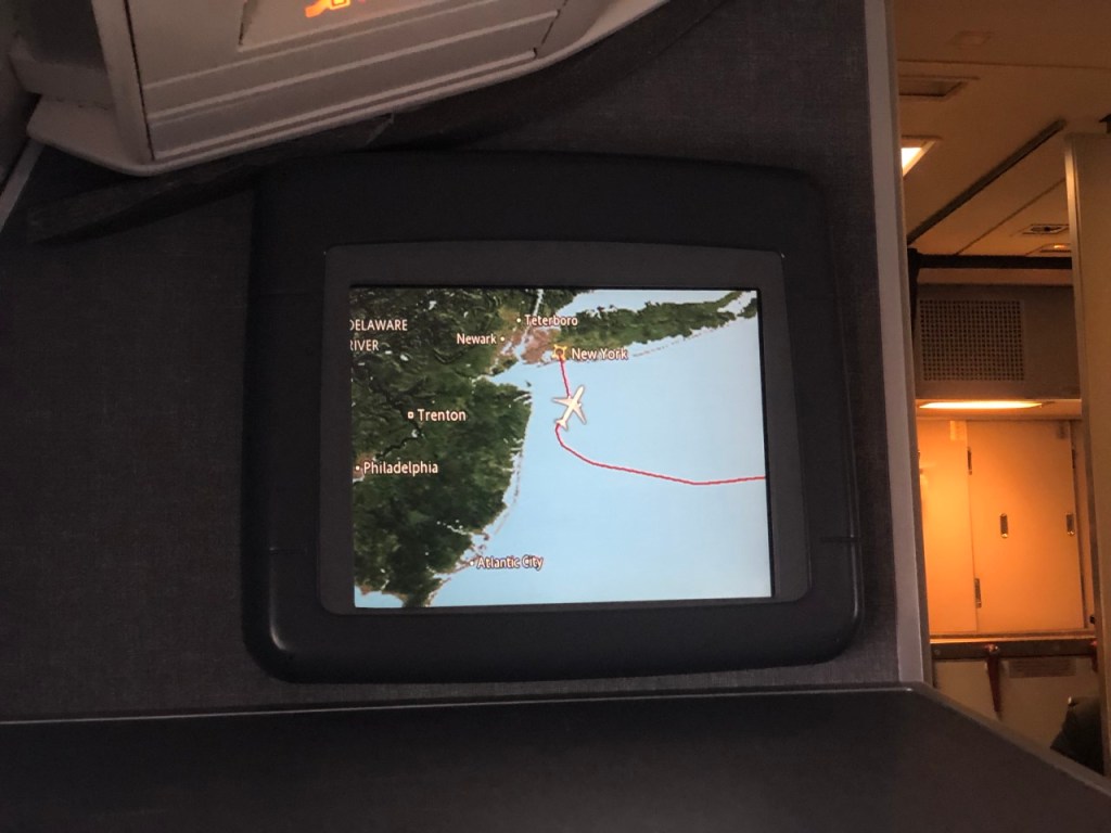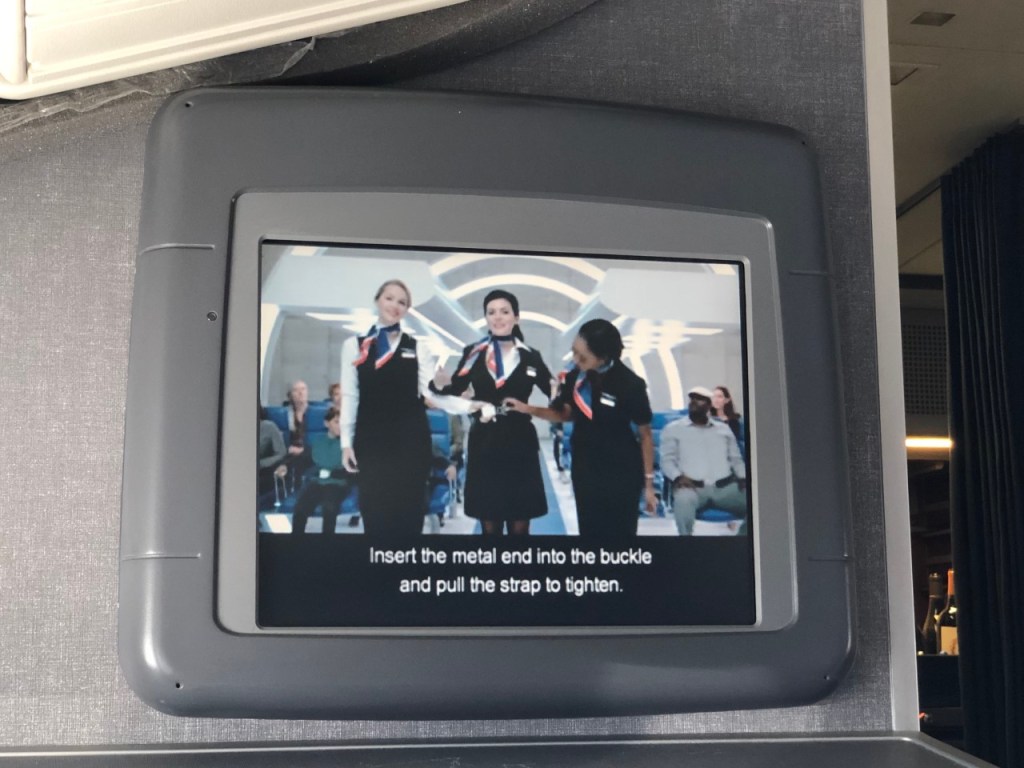 American’s safety video played over the wall and ceiling-mounted televisions while we started to taxi. There’s not much to report from that showing, but right before the briefing concludes, the main actress/narrator proudly declares “Great is what we’re going for!” That rings a bit hollow. Sure, business class is nice and all, but is this really the best AA can do? “Great” isn’t the first word that comes to mind…