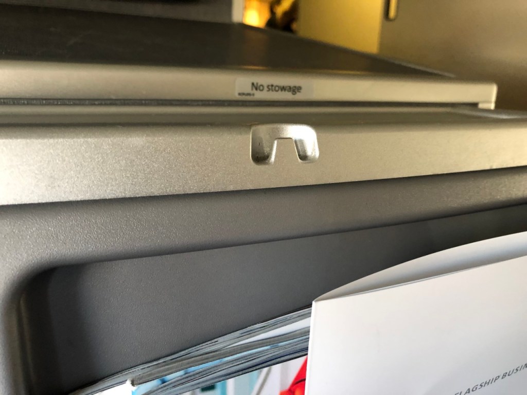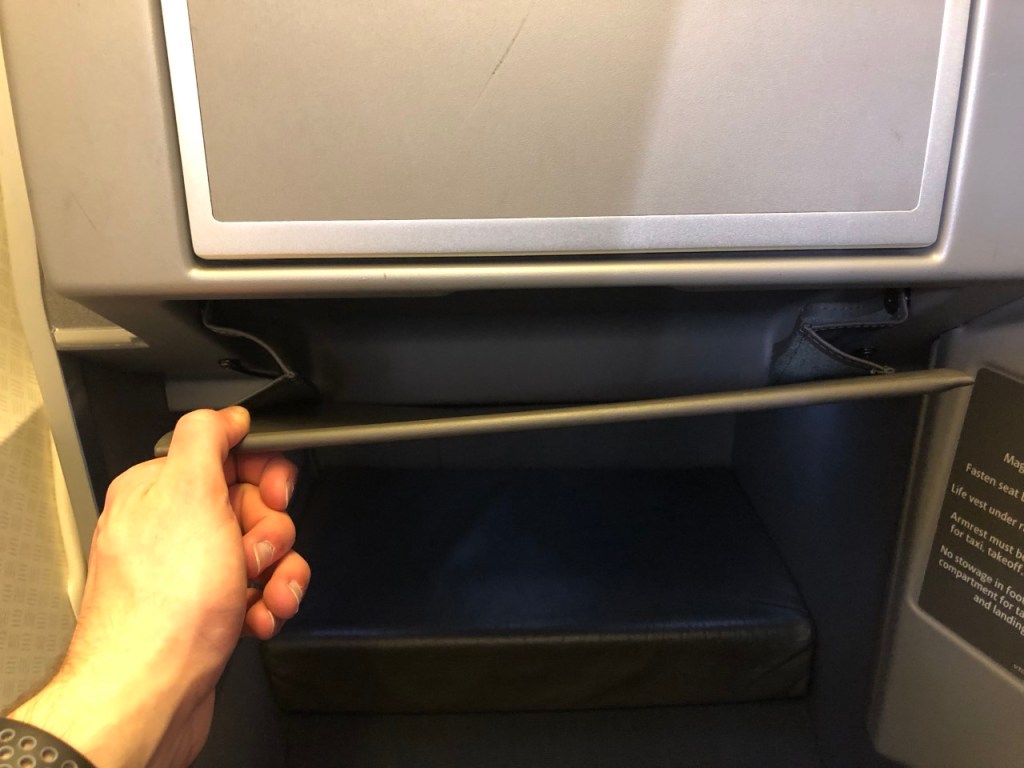 And there’s another, more practical storage pouch sandwiched above the ottoman and beneath the pull-out IFE shelf. It’s wide, deep, and stretchy enough to fit a laptop, an iPad, and a travel wallet all at once… if not more! It’s handy for sure, but there’s an uncomfortable question worth asking: how frequently does this pocket get cleaned out? Proceed with caution!
