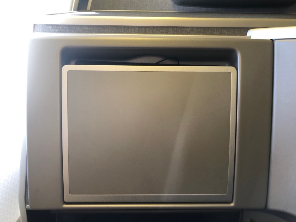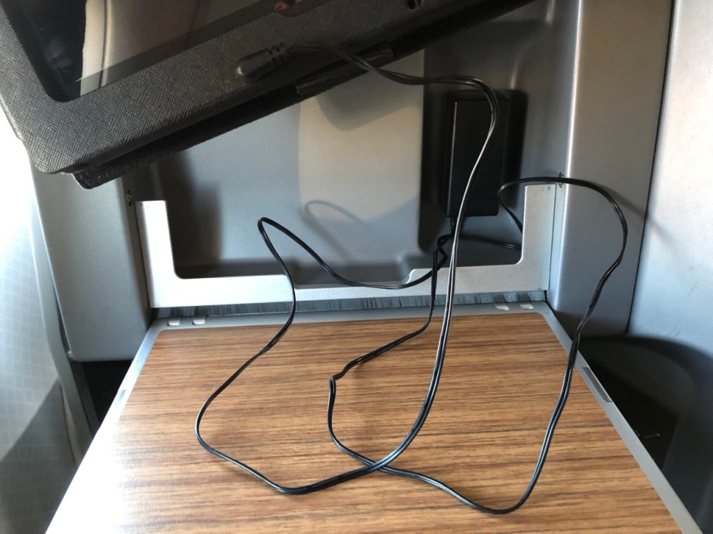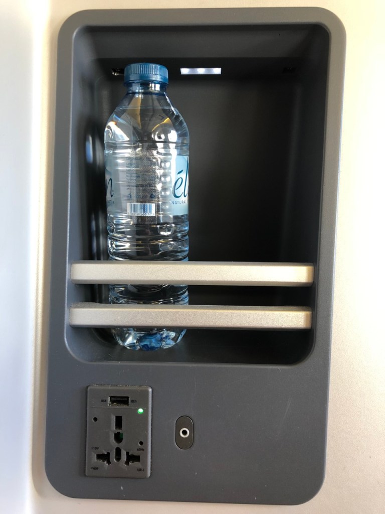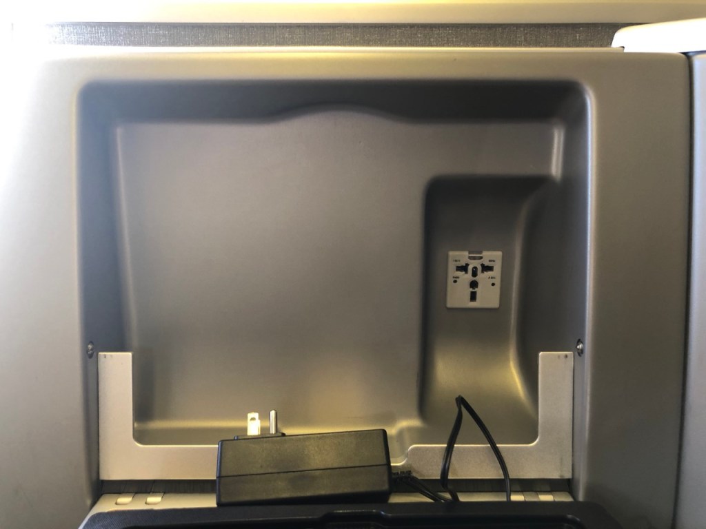 Along the back “wall” of the seat is another international power plug, plus a USB jack that can charge your mobile devices, a non-functioning headphone jack (“non-functioning” because — *eyeroll* — there’s no audio feed), and a small storage nook.