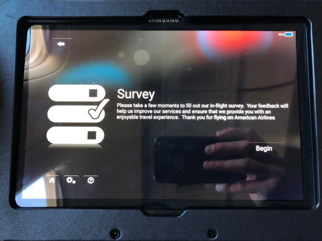 …Were all a bit too small. Everything at least was delicious, so, like the hard liquor selection, this snack gets a pass because it features quality over quantity. Then again, you shouldn’t have to compromise for minuscule portion sizes when you’ve bought such an expensive business class fare. Alas, AA, alas… When Marisol cleaned up the tray about an hour before landing though, she noted an opportunity to participate in a survey loaded on to the IFE tablet. If composing a seven thousand word review doesn’t suit your fancy, here’s a simpler way to communicate your opinions/frustrations.