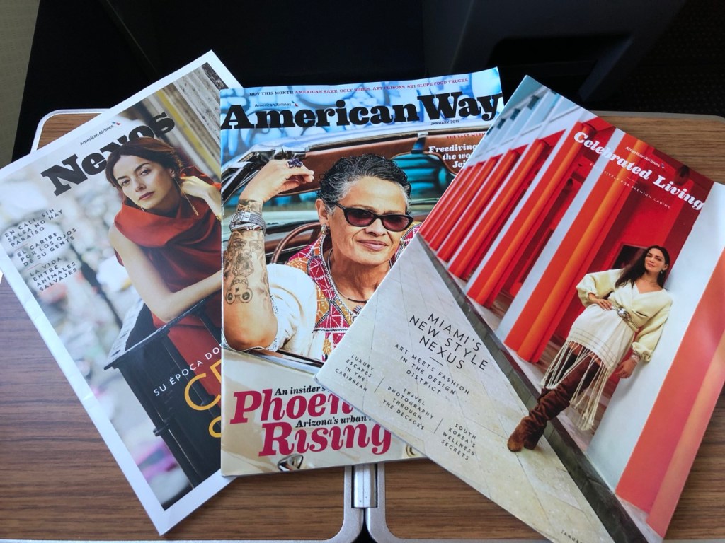There’s the usual safety card and air sickness bag in there, plus three separate magazines stuffed in too: American Way and Nexos, which are AA’s respective English and Spanish-language publications, as well as Celebrated Living, which is geared towards members of the bourgeoise. Go figure, the latter is exclusive to American’s premium cabins.