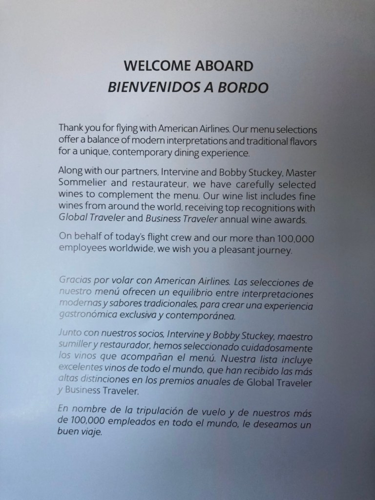 The seatbelt sign was turned off ten minutes in. Following that, Marisol walked down the aisle to formally welcome passengers by name, recognize AAdvantage and oneworld elite status holders, and encourage people to look at the menu in advance of lunch.