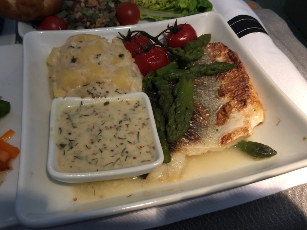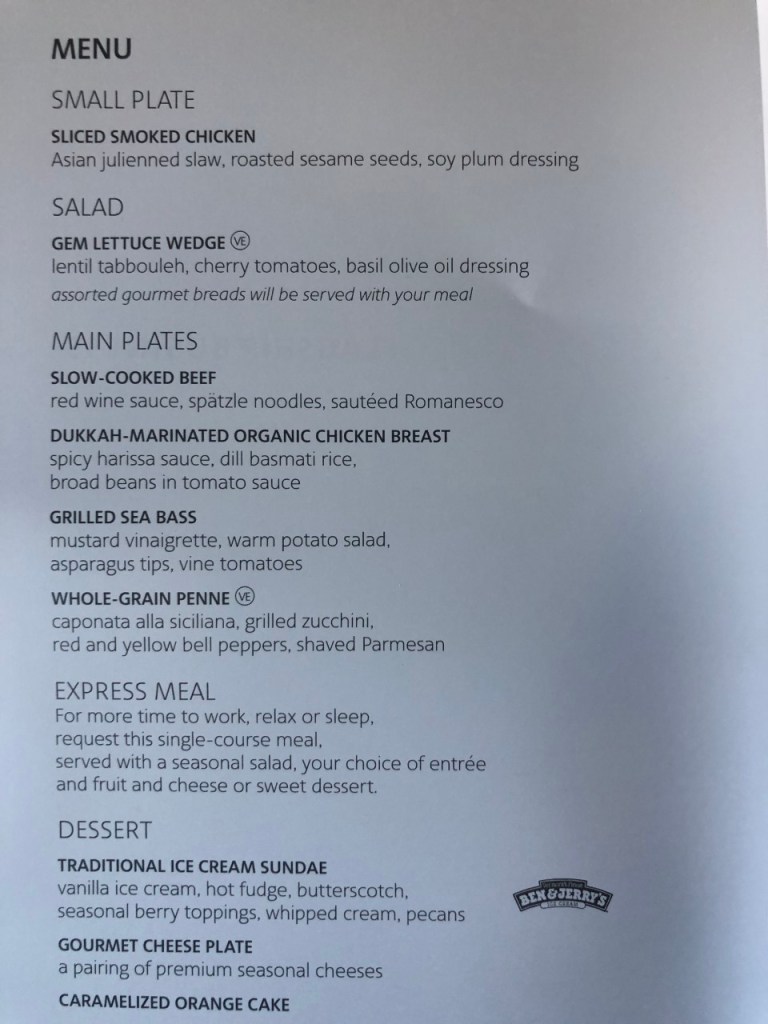 All three dishes tasted quite good, although none were particularly memorable. My personal favorite was the “sliced smoked chicken” small plate with fresh Asian slaw and a soy plum dressing, but the main course packed in a lot citrusy-but-nicely-balanced flavors and textures too. In-flight fish is prone to being quite dry, but this sea bass — in part due to the excellent mustard vinaigrette sauce — was an anomaly.