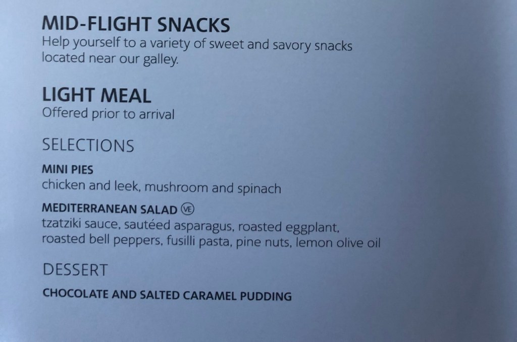 About two hours before landing, the cabin crew reappeared — largely for the first time since lunch — and invited passengers to peruse the “Light Meal” menu.