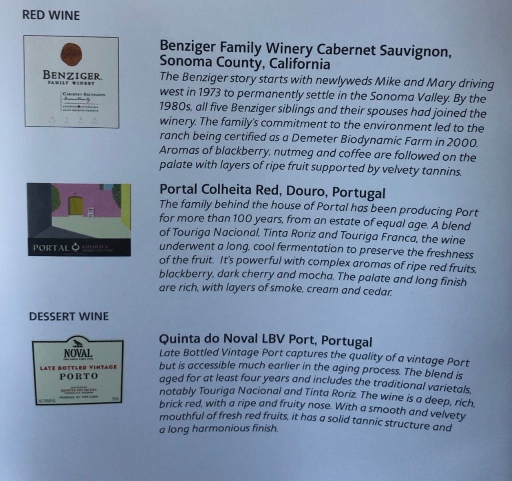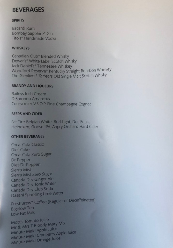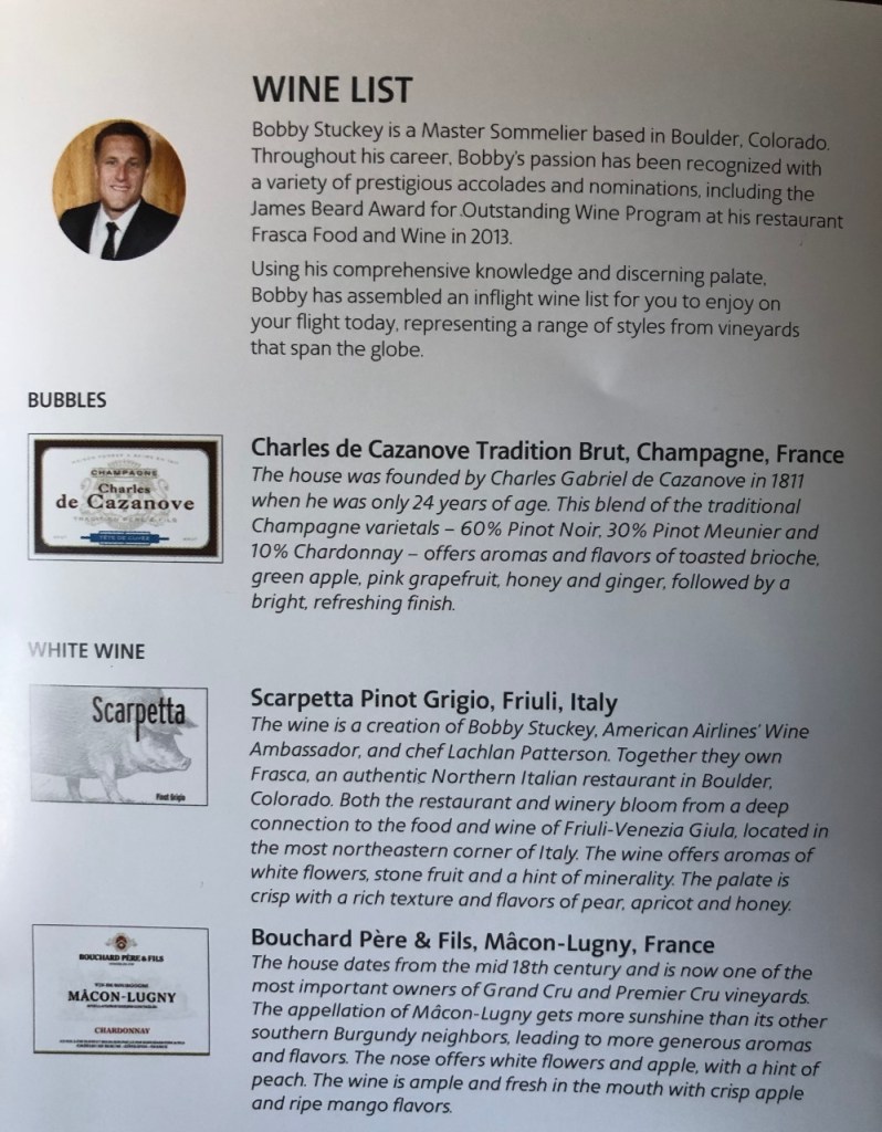 American, like any good U.S. carrier, offers Bud Light and four other brews, but the real draw is the wine list. It has a respectable collection consisting of two reds, two whites, one bubbly, and, for dessert, one Port.