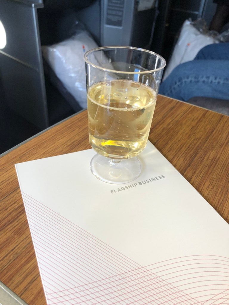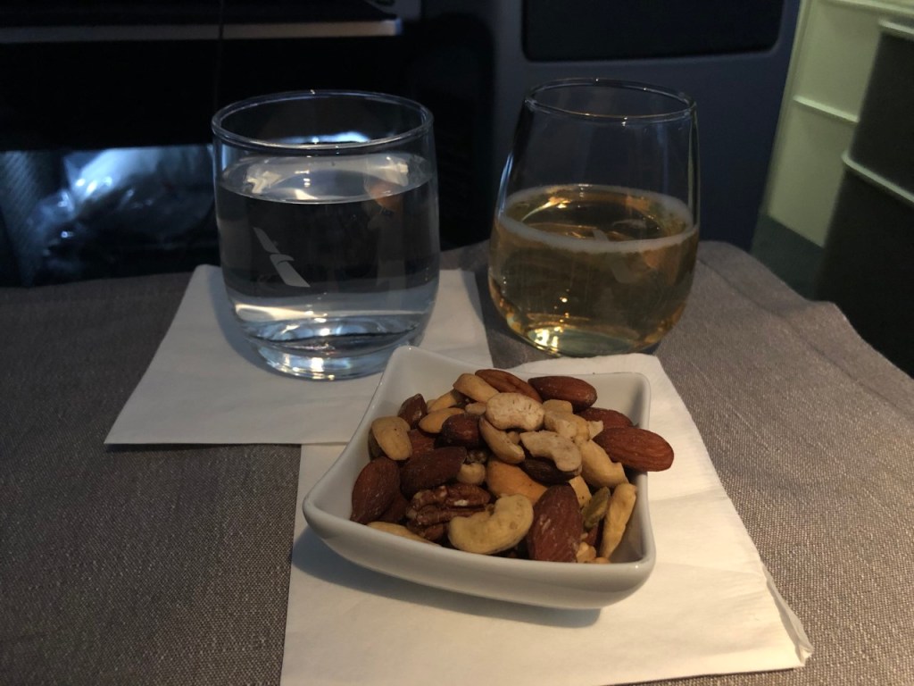 Despite the numerous choices available, I had another glass of the predeparture sparkling wine, the Charles de Cazanove Traditional Brut champagne. It was presented with warm nuts and some still water about thirty minutes in to the flight, and then two minutes later a flight attendant appeared to drop off a not-so-warm towel which, for the record, was really gross! Hot OR cold towels are both fine, but the lukewarm middle ground is a sensual nightmare.