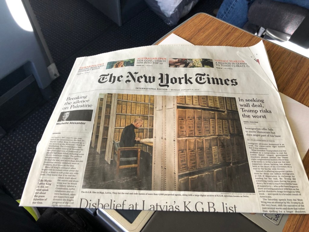 Once drinks were served, another flight attendant pushed a literature cart through the cabin. There were plenty of fresh, complimentary copies of the New York Times, the Financial Times, and El País available for the taking.