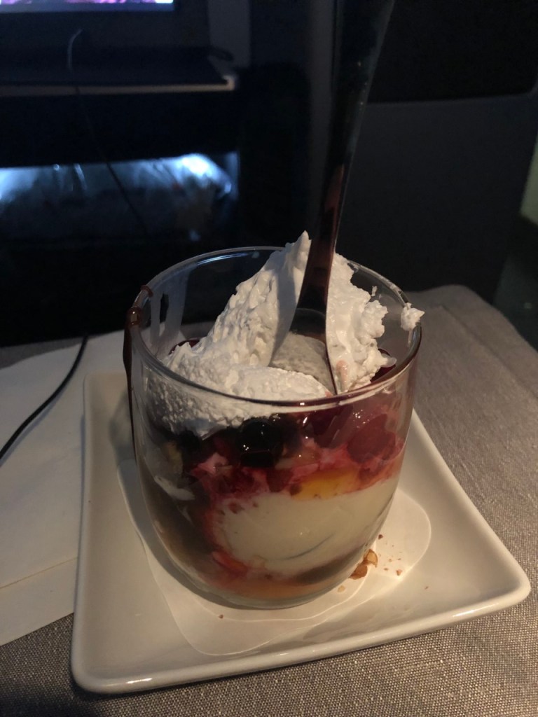 There was a choice between a cheese plate, a slice of caramelized orange cake, and a sundae for dessert. As this review reflects, dining in a premium cabin on a U.S. airline is a generally fine-but-not-out-of-this-world experience, but the ice cream is an exception that holds its own. It’s not fancy or all that elaborate but damn is it satisfying!