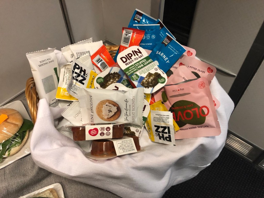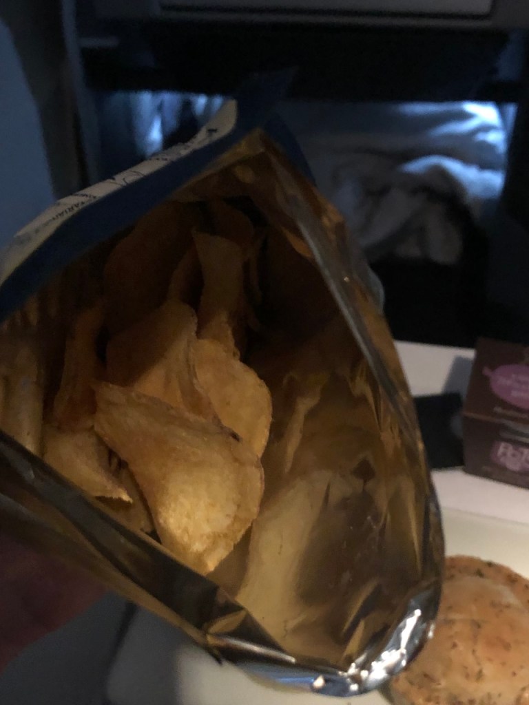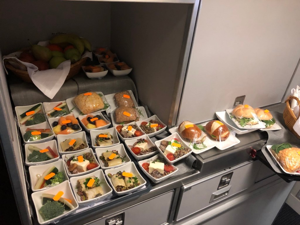 The door to the lavatory is right across from the galley, and that positioning isn’t ideal to say the least. The dining menu advertises “Mid-Flight Snacks” available in between the two meal services, and the crew delivered on this and arranged them all in a conveniently accessible spot that’s perhaps a bit too close to the toilet. The spread today included what you might expect, like high quality dried goods such as crackers, dips, and chips…