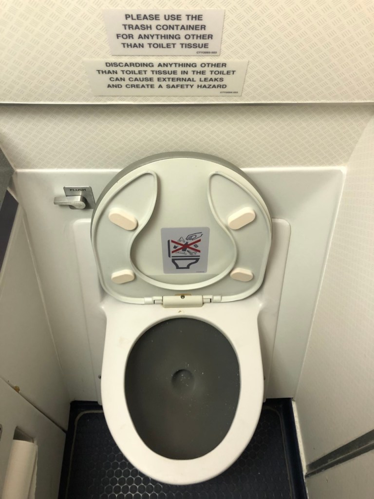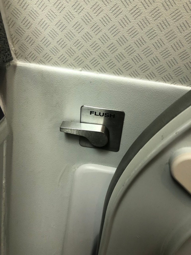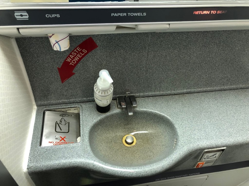 The size of it was fine and nothing was extraordinarily filthy — the floors weren’t covered in fluid nor were there other horrifying surprises — but the WC was definitely past its prime. AA needs to deep-clean it or, better yet, replace it entirely if it wants to offer a perma-grime-free place for its premium customers to use the bathroom.