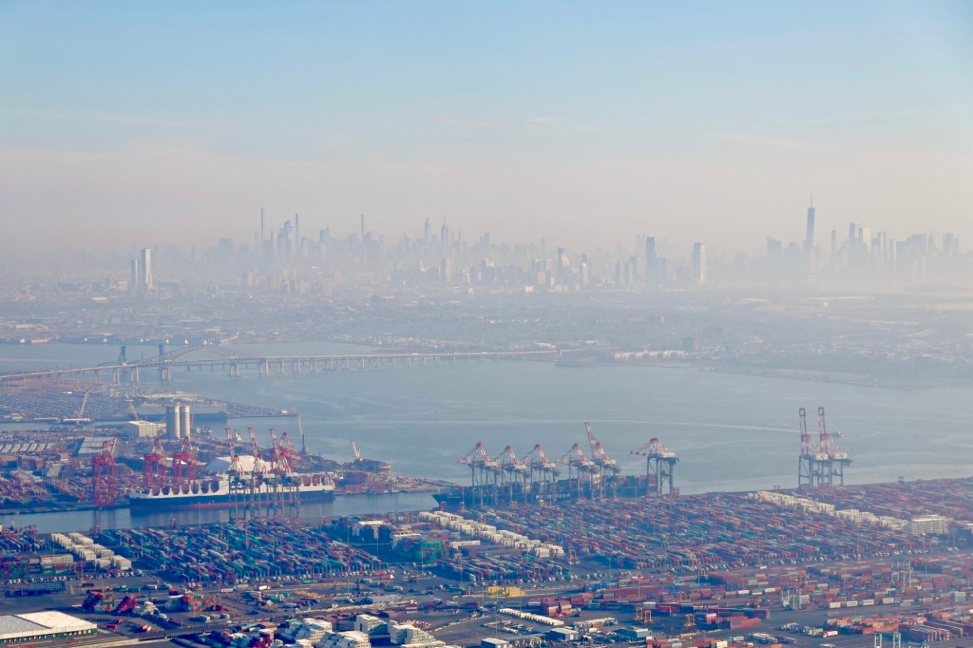 Shot above Newark Liberty International Airport looking toward Manhattan.